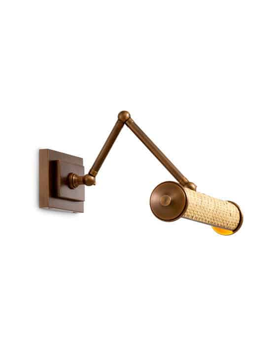 Introducing the Wall Lamp Luca in an antique brass finish, showcasing natural rattan details that bring a warm, organic touch to its luminous presence.The harmonious blend of textured rattan with a rich, aged metallic glow creates an inviting, elevated ambiance, ideal for sophisticated interiors seeking subtle yet distinctive lighting elegance.