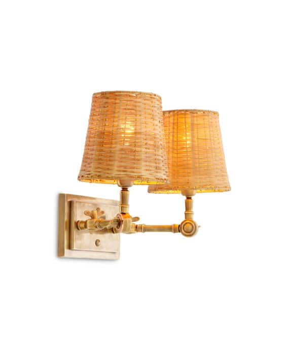 Inviter elegancen fra boutiquehoteller ind i dit hjem med Eichholtz Wentworth Double væglampe. Inspireret af klassiske væglamper er vores populære Wentworth-model nu også fås med rottingskærme. Den har en armatur i messing og to justerbare arme, der gør det nemt at placere skærmene efter dine ønsker. Skærmene er smukt fremstillede i flettet rotting og giver en luksuriøs fortolkning af en naturlig og jordnær æstetik.